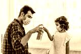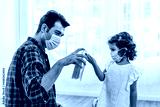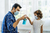 Father giving and pouring alcohol hand wash gel to his daughter put on hand to protect her from coronavirus disease outbreak, Virus and illness protection.