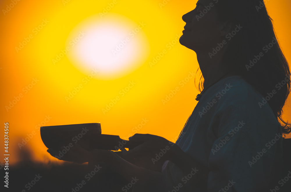 Silhouette of woman playing a Tibetan bowl at gorgeous sunset with sun disk orange gradient. Concept: peace, tranquility, zen, spirituality, sound healing