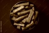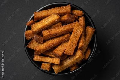 Bowl of rye croutons on black background