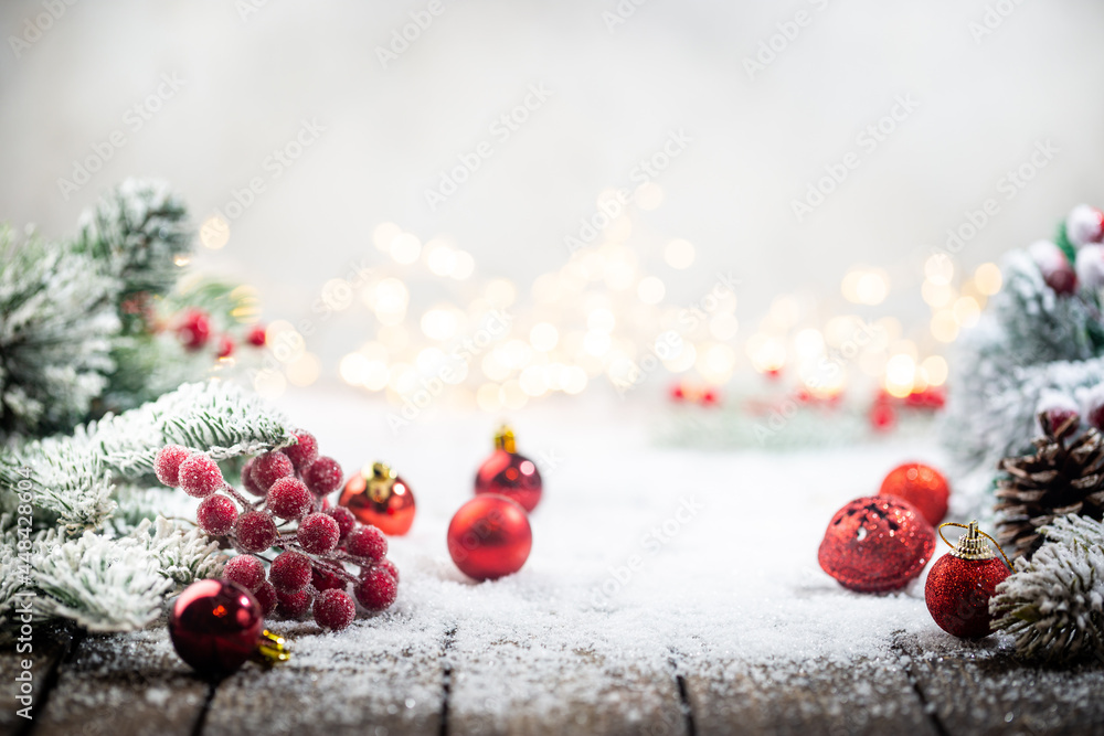 Christmas red decorations on snow with fir tree branches and christmas lights. Winter Decoration Background with copy space for text