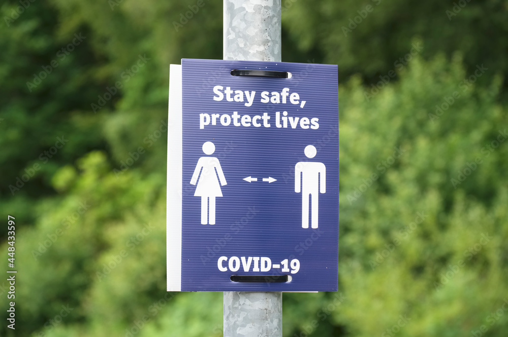 Social distancing sign at train station to stay safe