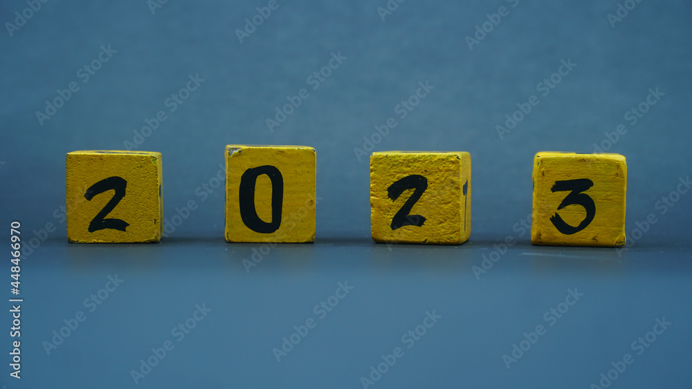 Wooden block calendar with numbers for 2023. Yellow on a dark background