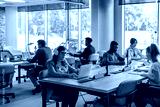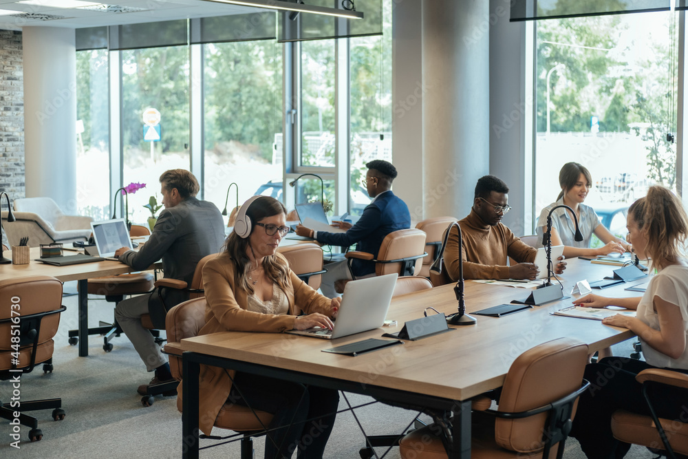 Group of six multi-ethnic businesspeople working together in an open plan office, they using laptop computers, tablets