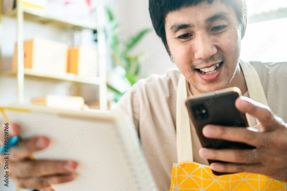 Asian male hand writing order product list on note for online customer in warehouse home office ordering products from online to business cargo supply market service delivery form home office