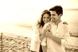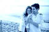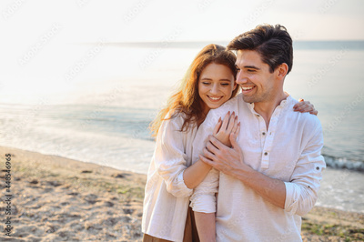 Smiling young couple two friends family man woman 20s in casual clothes hug girlfriend put head on boyfriend shoulder at sunrise over sea sand beach ocean outdoor seaside in summer day sunset evening.
