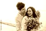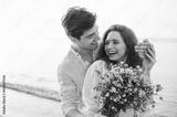 Young fun surprised couple family man woman in white clothes rest relax together boyfriend meet girlfriend close eyes gift give bouquet flowers at sunrise over sea beach outdoor seaside in summer day.