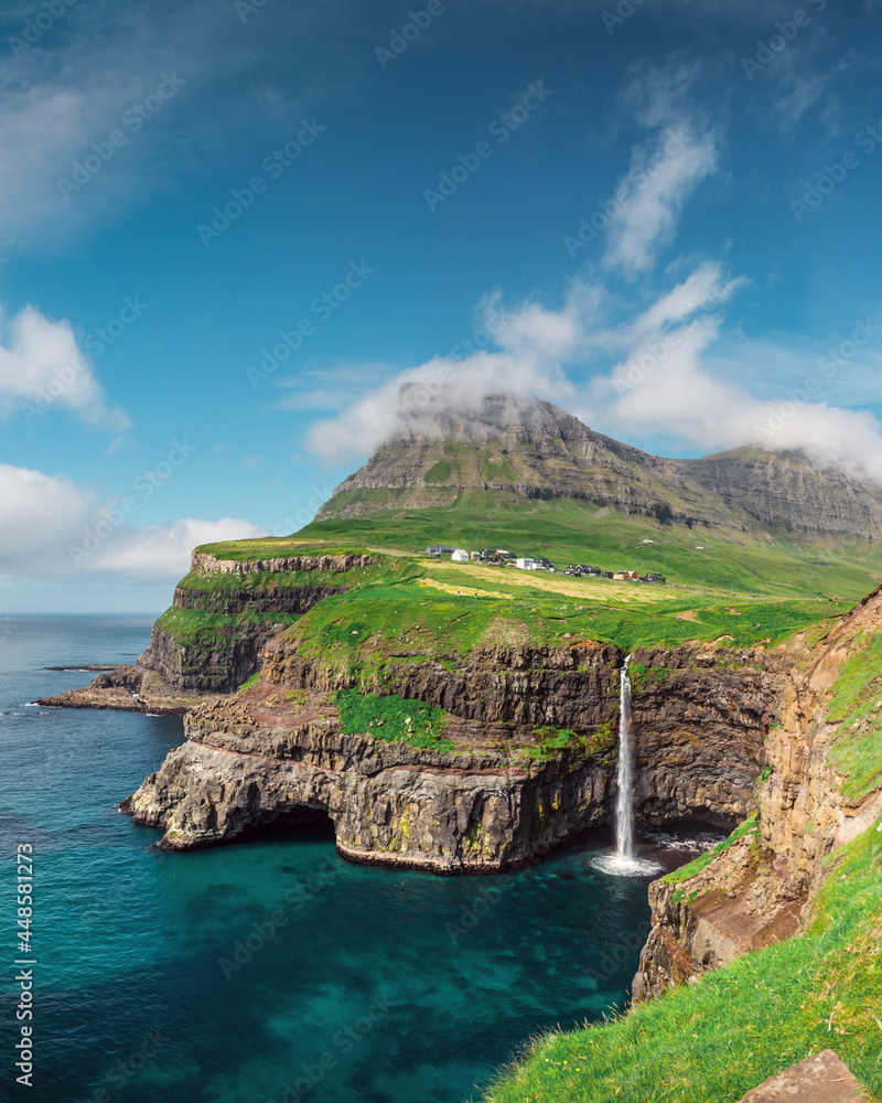 Mulafossur waterfall in Gasadalur, Vagar Island of the Faroe Islands