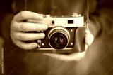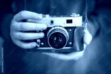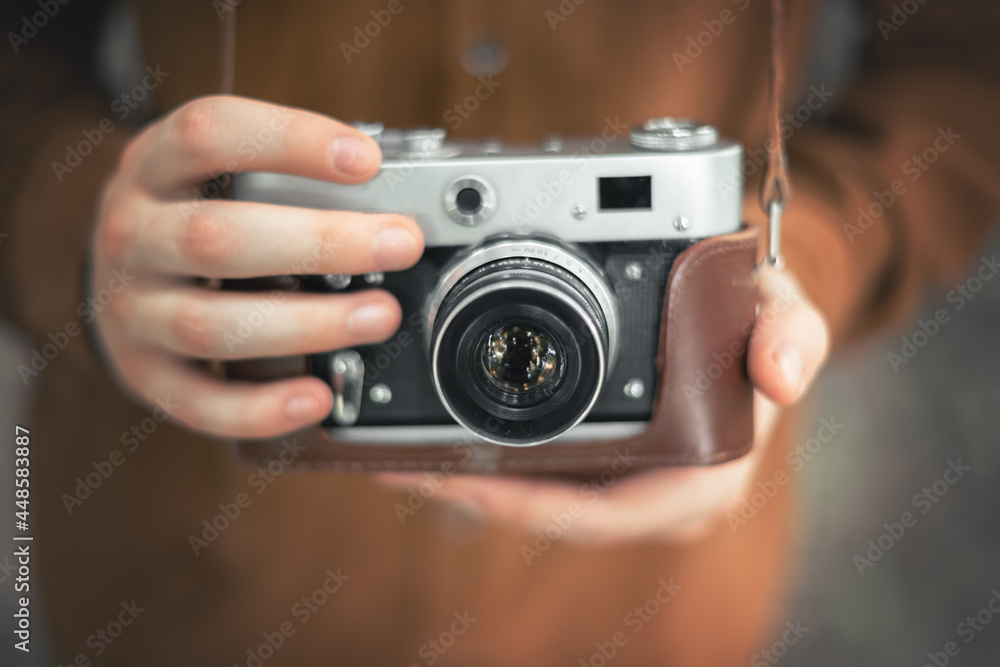 Photographer in brown jacket with retro camera