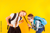 The cute little schoolboy pulls the schoolgirl's braid