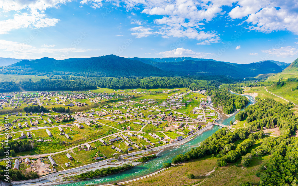 Beautiful Hemu Village with natural scenery in Xinjiang,green mountain and forest with rivers.Hemu Village is a famous travel destination in China.Aerial view.