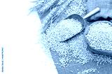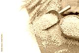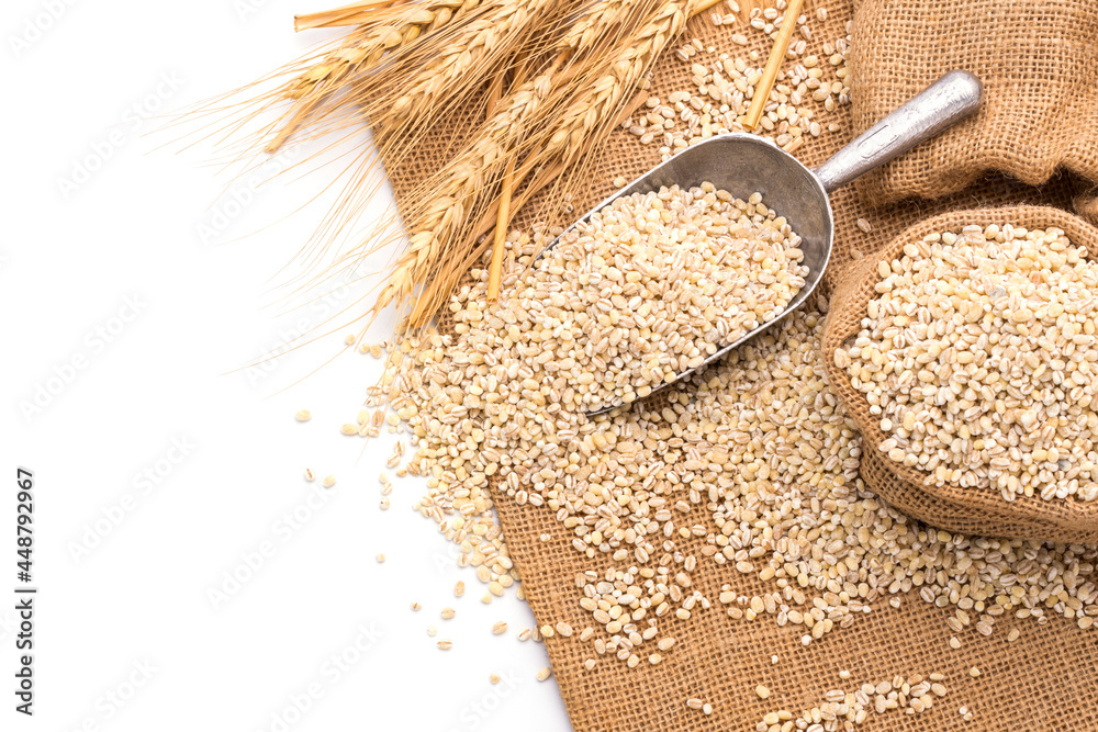 Wheat grains and ripe wheat ears isolated on white background - top view.