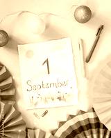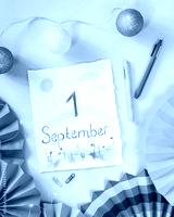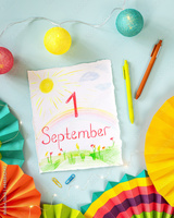 Holiday, school composition with white sheet with a child's drawing and inspiration first september, paper fans and a light garland on a blue background. Back to school concept. Flat lay
