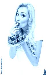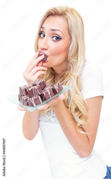 Young woman eating pralines, studio-shot