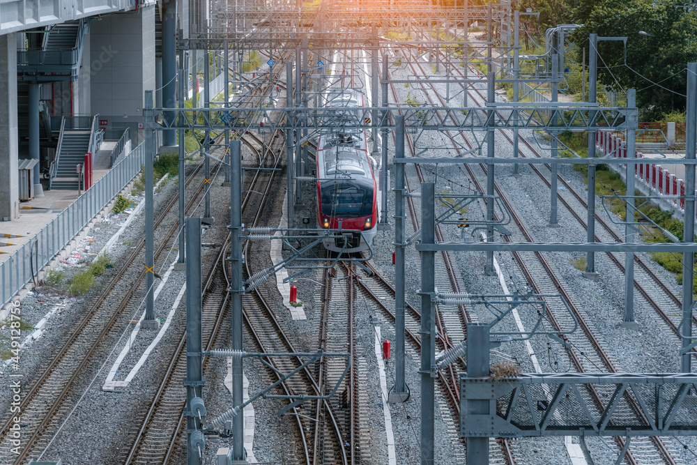 The electric train drives at high speed motion from the station with passenger and cargo to station destination is modern trasportation concept with sun light sky background.