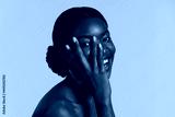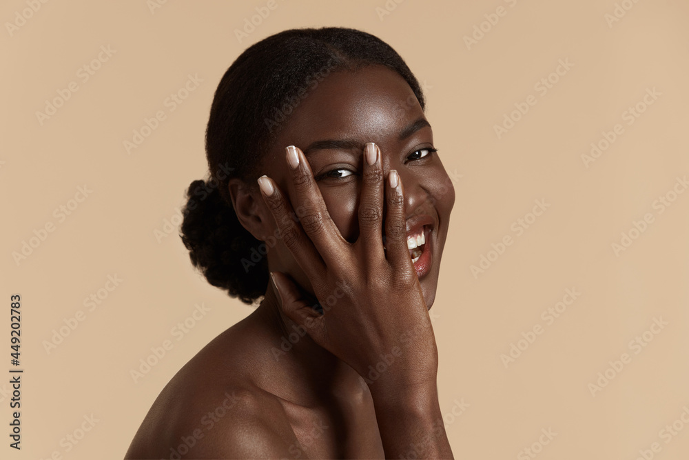 Portrait close up of beautiful african girl. Happy young woman touch her clean face and looking at camera. Concept of face skin care. Isolated on beige background. Studio shoot
