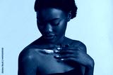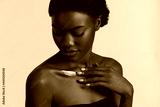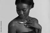 Portrait close up of beautiful black girl apply cosmetic cream on body. Serious young woman with perfect skin. Concept of skincare. Isolated on beige background. Studio shoot