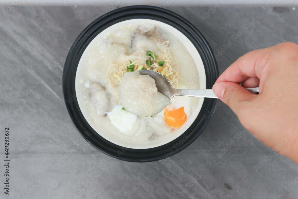 rice gruel or rice porridge or congee with pork ball and egg