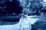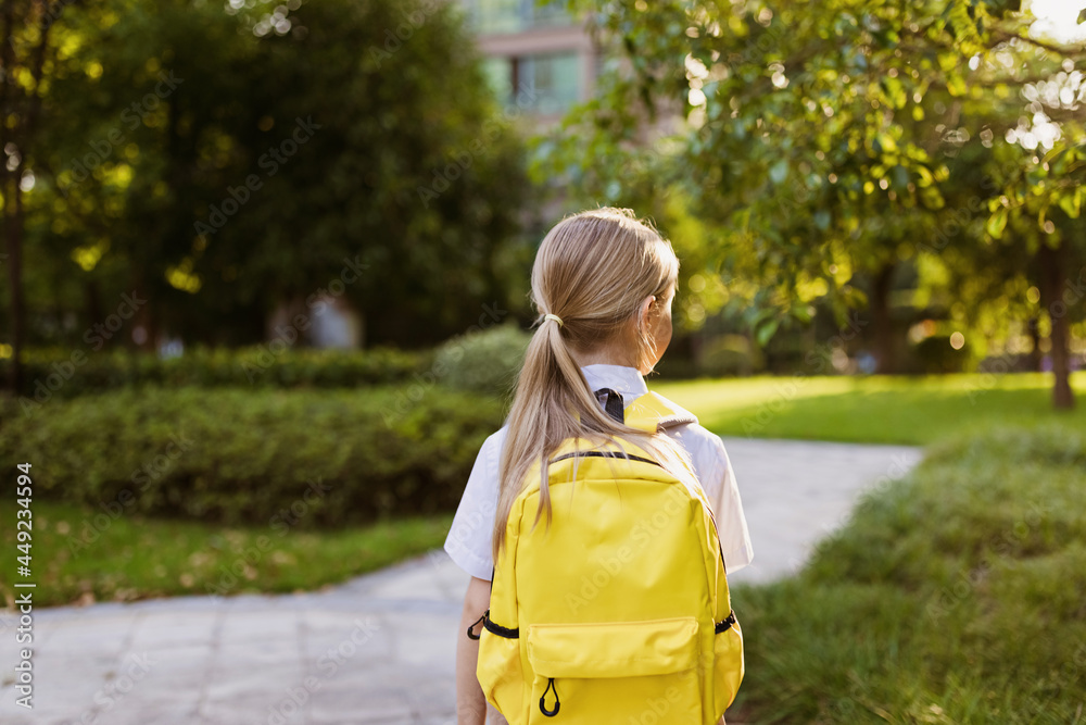 Back to school. Little girl with yellow backpack from elementary school outdoor. Kid going learn new things 1th september after end Coronavirus covid-19 quarantine and self isolation