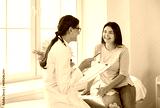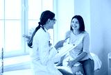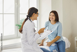 Doctor discussing treatment with cheerful smiley female patient. Happy physician and young woman talking and laughing sitting on examination bed in modern clinic or hospital