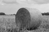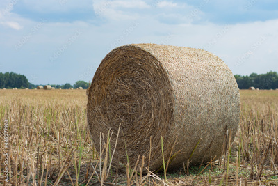 Haystacks are collected from the field in summer against the background of the sky with clouds.