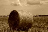 Haystacks are collected from the field in summer against the background of the sky with clouds.
