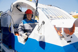 Miner engineer prepares to descend into ground on rail locomotive to mining