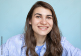 Emotional happy young woman laughing and smiling into camera in casual shirt on the blue background