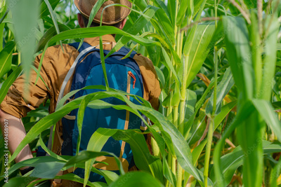Male tourist walks in a corn field with a travel backpack. Concept on the topic of tourism.