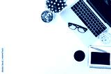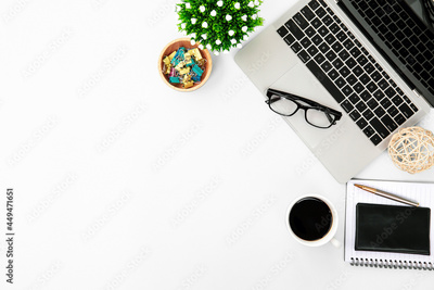 Top view desk or top view table with computer laptop and office equipment for work area copy space and work from home or education school background concepts.