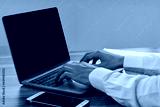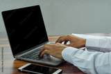 Closeup hand typing keyboard computer working in office, Businessman using computer notebook looking on screen