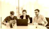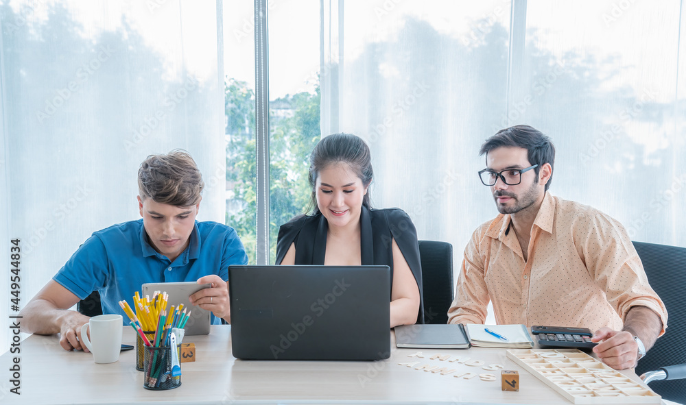 Businessmen and businesswoman team looking at computer and paper of work discussing for work diagram in office company with business meeting success concept.