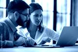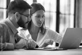 Focused young Caucasian man and woman colleagues coworkers look at laptop screen discuss business ideas together. Serious diverse employees work on computer brainstorm in office. Teamwork concept.