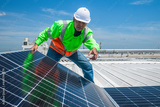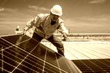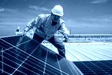 Engineer wearing unifrom and helmet inspect and check solar cell panel ,solar cell is ecology energy sunlight power installation for industrail ,alternative environment power concept.