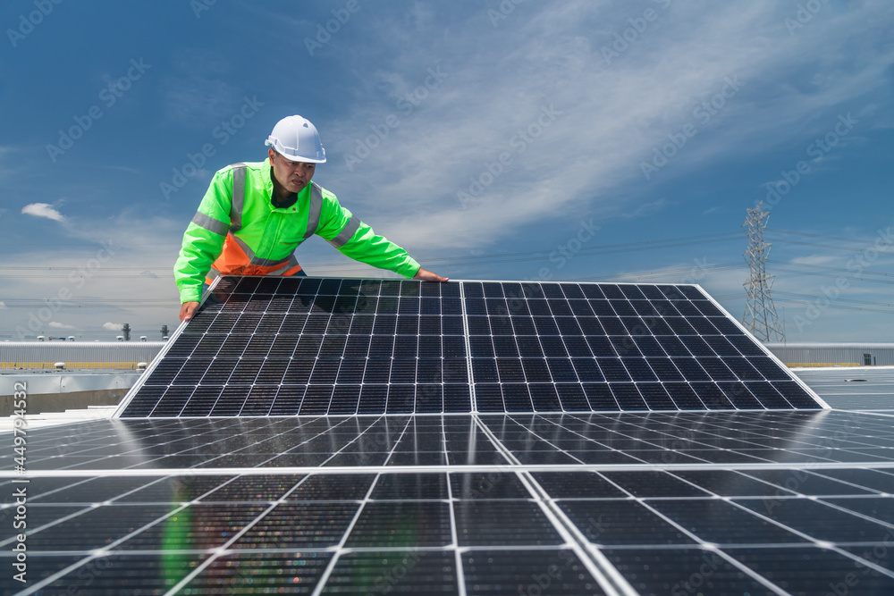 Engineer wearing unifrom and helmet inspect and check solar cell panel ,solar cell is ecology energy sunlight power installation for industrail ,alternative environment power concept.