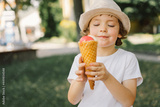 Boy in a hat is holding an ice cream and looks happy and surprised. Summer food and summer time