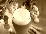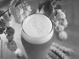A glass of light beer and a branch of green wild hops on a wooden table close up