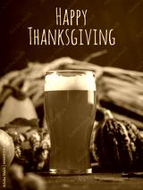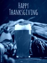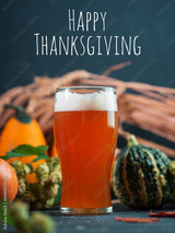 Thanksgiving composition, a glass of pumpkin ale, fresh pumpkin, autumn leaves on the table