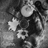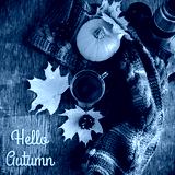 Hello autumn flat lay composition on a wooden table a cup of hot coffee , maple yellow leaves, a colorful warm scarf and an orange pumpkin