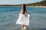 people, summer and swimwear concept - happy smiling young woman in bikini swimsuit with cover-up on beach