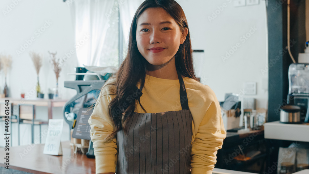 Portrait young Asian woman barista feeling happy smiling at urban cafe. Small business owner Korean girl in apron relax toothy smile looking to camera standing at the counter in coffee shop.