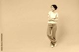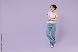 Full length young smiling happy woman 20s wear white t-shirt looking aside on workspace area hold hands crossed folded isolated on pastel purple background studio portrait. People lifestyle concept