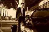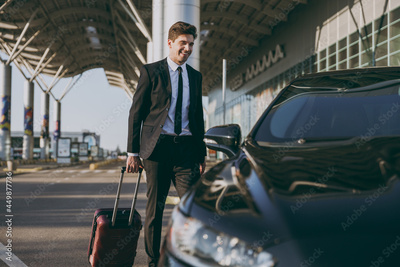 Full body bottom view young traveler businessman young man in black dinner suit going walk outside at international airport terminal with suitcase to car booking taxi Air flight business trip concept