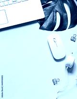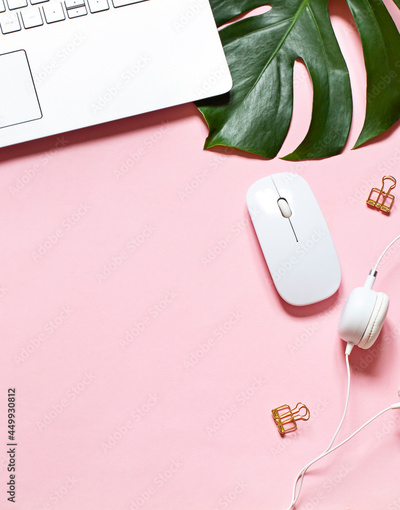 Business concept flat lay with a laptop on the pink background. Top view. Copy space