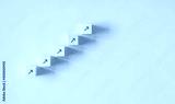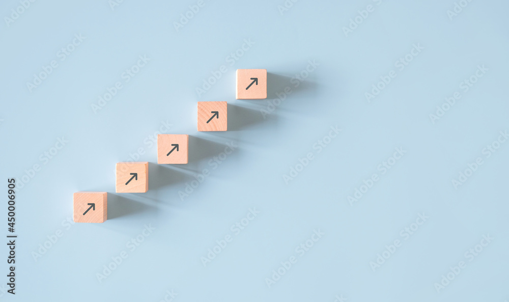 Business concept growth success process, Minimal Wood block stacking as step stair on paper blue background, copy space.