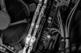 RAM memory in computer motherboard. Inside desktop PC plenty of dust. Dirty PC need to clean. PC system. Computer hardware. Electronic chip. PC RAM, fan, and cable wire in CPU of desktop computer.