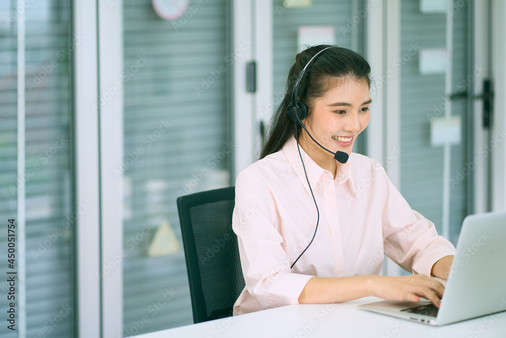 Asian smiling female call center talking with headset and find information by laptop to support customer problem
