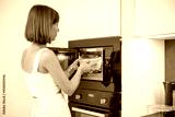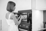 Woman heating food with microwave machine at home, female using modern kitchen appliances