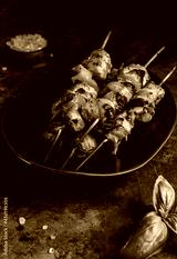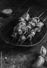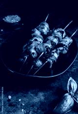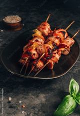 Grilled meat skewers. Chicken shashlik and vegetables on dark background. Selective focus