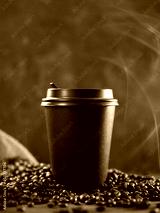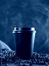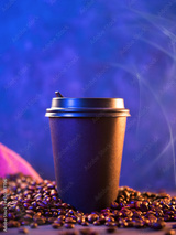 A paper cup of coffee stands on a roasted coffee bean, purple background copy space