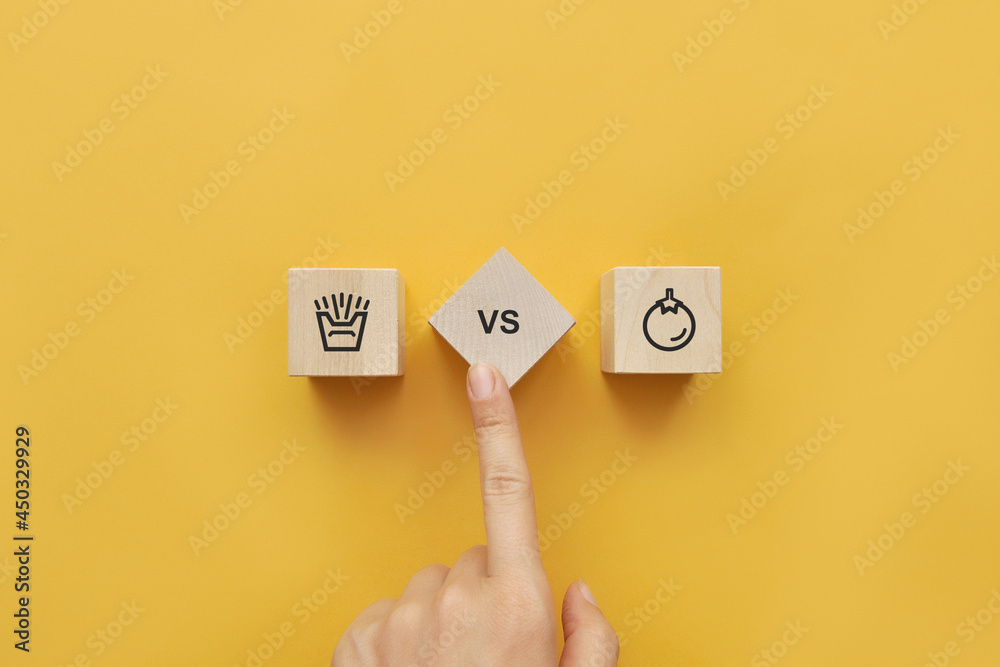 Wooden cubes with drawings of harmful and healthy food. A symbol of the choice between healthy and harmful food